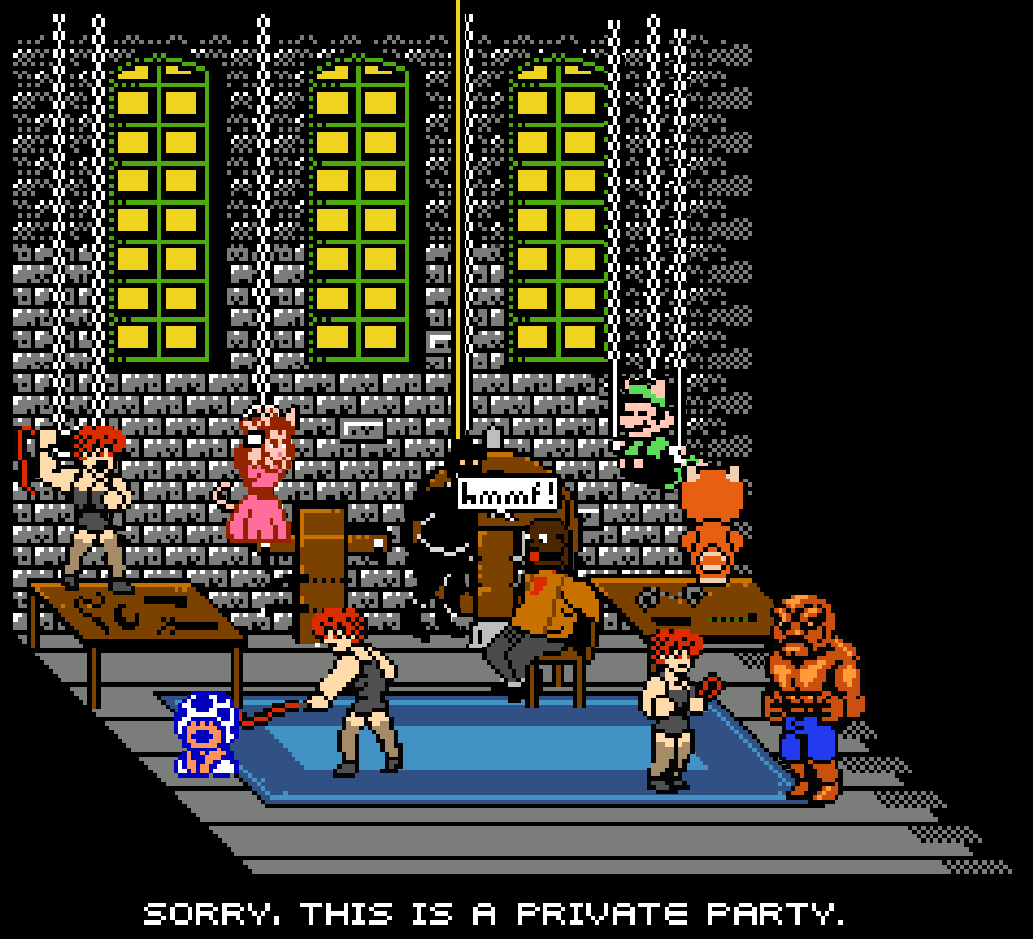 In Abobo's Big Adventure, Princess Peach only appears in the Private Party Easter Egg in Double Drabobo, alongside Toad, Tanooki Mario, and Raccoon Luigi. She is shown hanging on a chain while being tortured by one of the three Private Party Girls.